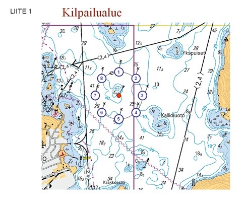 Oheinen merikarttaote näyttää kilpailualueen ja kiinteiden merkkien sijainnin. Ympyrän kehällä olevat merkit 1–8 ovat ratamerkkejä.