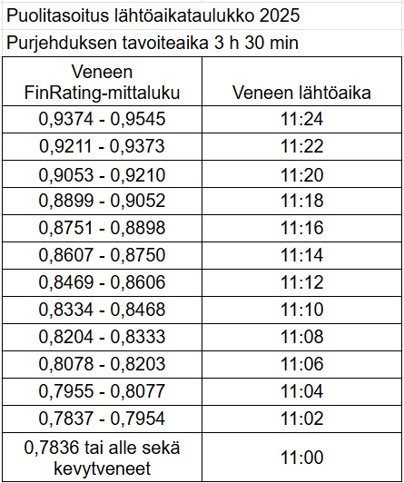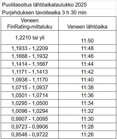 - Lähtöaika = Alla olevan 3 h 30 min tavoiteajalla lasketun lähtöaikataulukon mukaan. Lähtöaikataulukkoon on laskettu veneen lähtöaika veneen FinRating-mittaluvun perusteella
