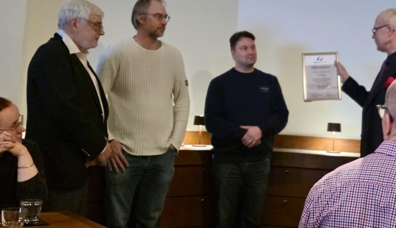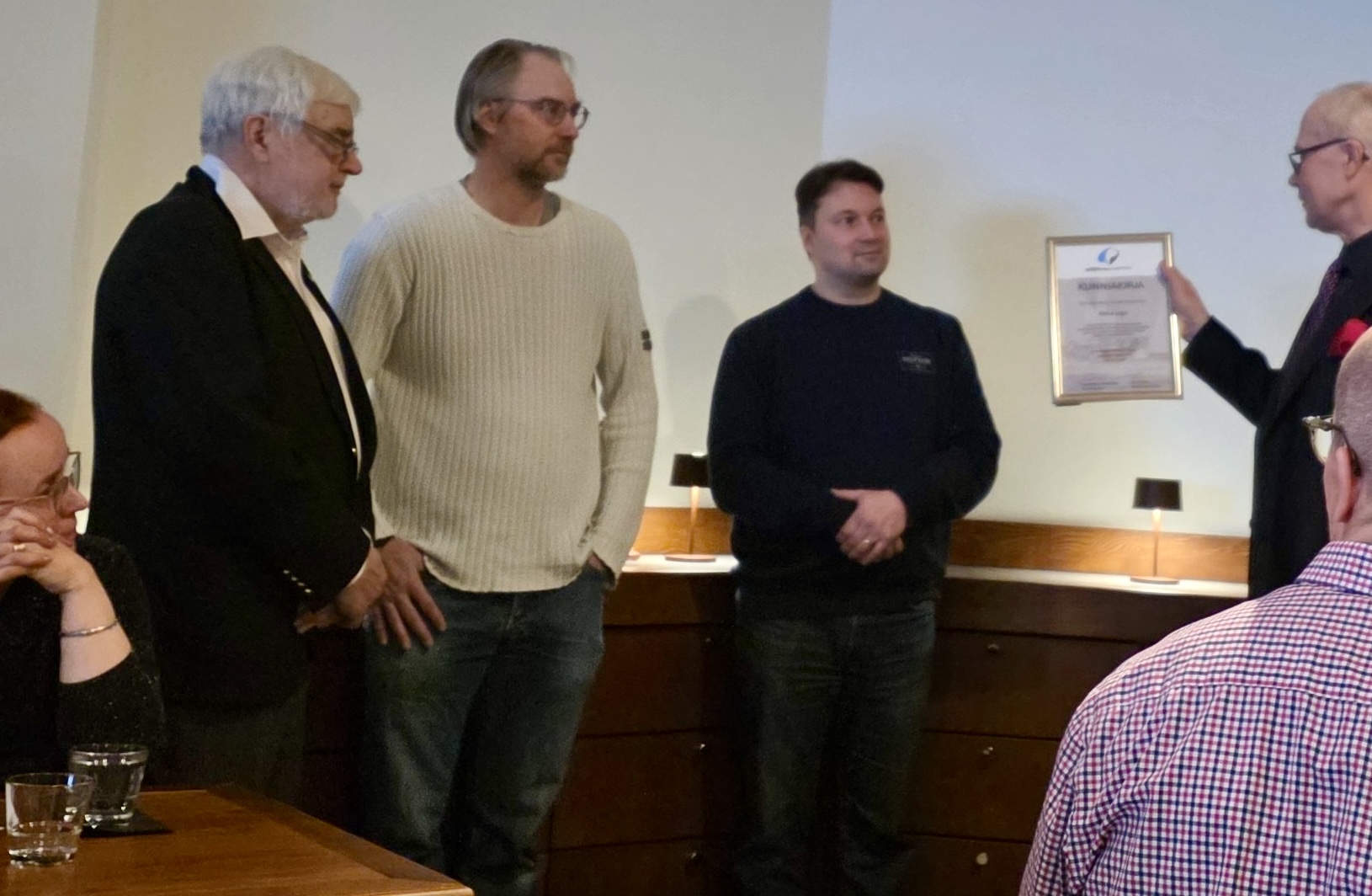 Kuvassa Ilkka Liljalle luovutetaan kunniakirja, koska hänestä tuli tänä vuonna ainoa henkilö, joka on osallistunut kaikkiin Päijännepurjehduksiin! Kuva: Heikki Vepsäläinen
